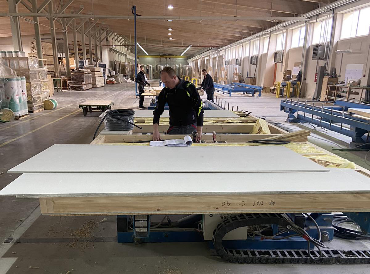 Die Elemente für die äußere Verkleidung der Gebäude werden in unserem Werk vorgefertigt. Alle unsere Baumaterialien sind vom TÜV zertifiziert, unser Holz trägt das international anerkannte FSC-Siegel für nachhaltige Holzwirtschaft.